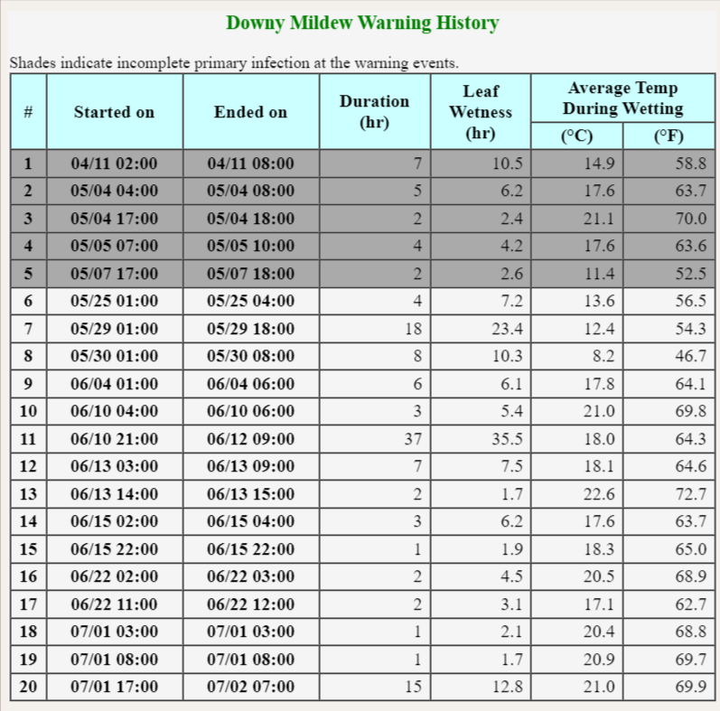 Here are recent downy mildew infection risks based on the NEWA’s DMCast.