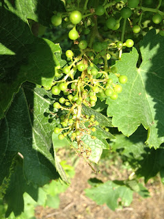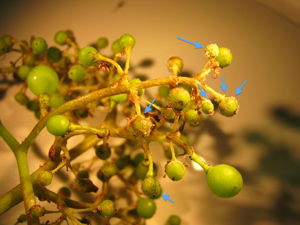 Picture on the top is a cluster showing downy mildew infection on the tip of a cluster. The picture below is a close up of another cluster with downy mildew. I put arrows on berries with downy mildew spore structures.