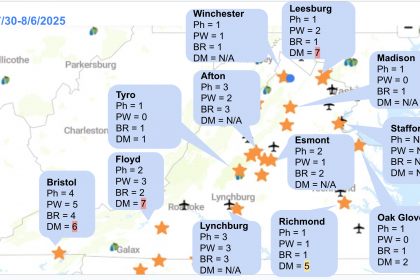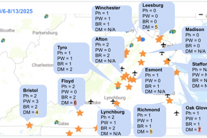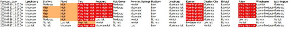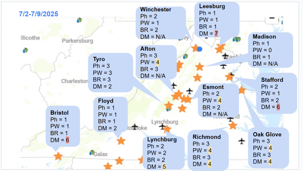 In addition, we generated downy mildew forecasted risk based on the past seven days of weather and an 8-day forecast. Please click the figure below to enlarge. The rains from last week and forecasted rain events pose high-risk events for several locations across Virginia. This effort has been supported by the VA Wine Board and Southern Region Small Fruit Consortium.