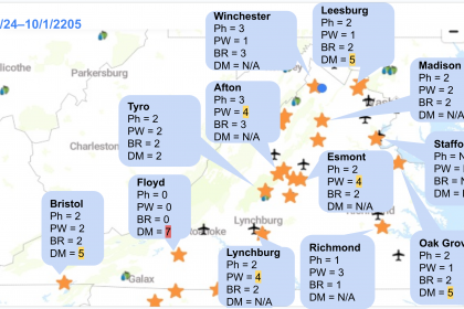 We generated the downy mildew forecasted risk based on the past seven days and an 8-day weather forecast. Please click the figure below to enlarge. The model seems to be calling for an incoming rain forecast starting tomorrow in some locations (which was forecasted last week, too). The VA Wine Board and Southern Region Small Fruit Consortium have supported this effort.