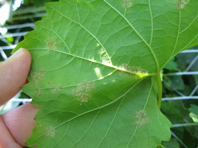 If you have some downy mildew issues, it is probably a good idea to mix a phosphonate (phosphorous acid, such as Prophyt, Agri-Fos, etc, 0-day PHI) with captan. Sine we have experienced a frequent rain events and humid nights that were very conducive for downy mildew development in the past few weeks, please make sure to scout your vineyards for downy mildew. It tends to appear on younger leaves on the top of the canopy first. You may or may not see yellow “oil spot” on the top surface of the leaves, so, make sure to flip leaves over to look for downy mass of spores. I know you are probably focused on your clusters now, but leaves are also important! Downy mildew cannot get to berries at this time of the season, but heavy infection on leaves can defoliate leaves. Your vines will need these leaves to mature berries and also to store carbohydrate for winter survival.