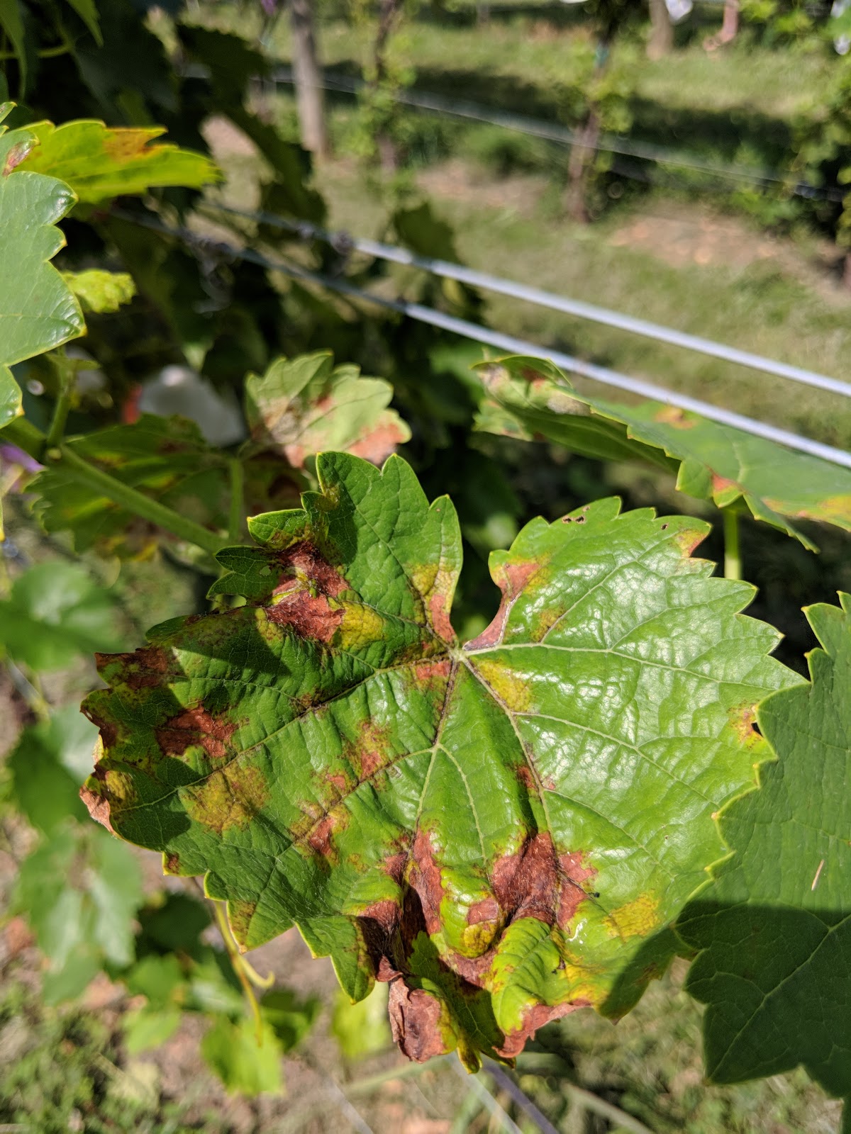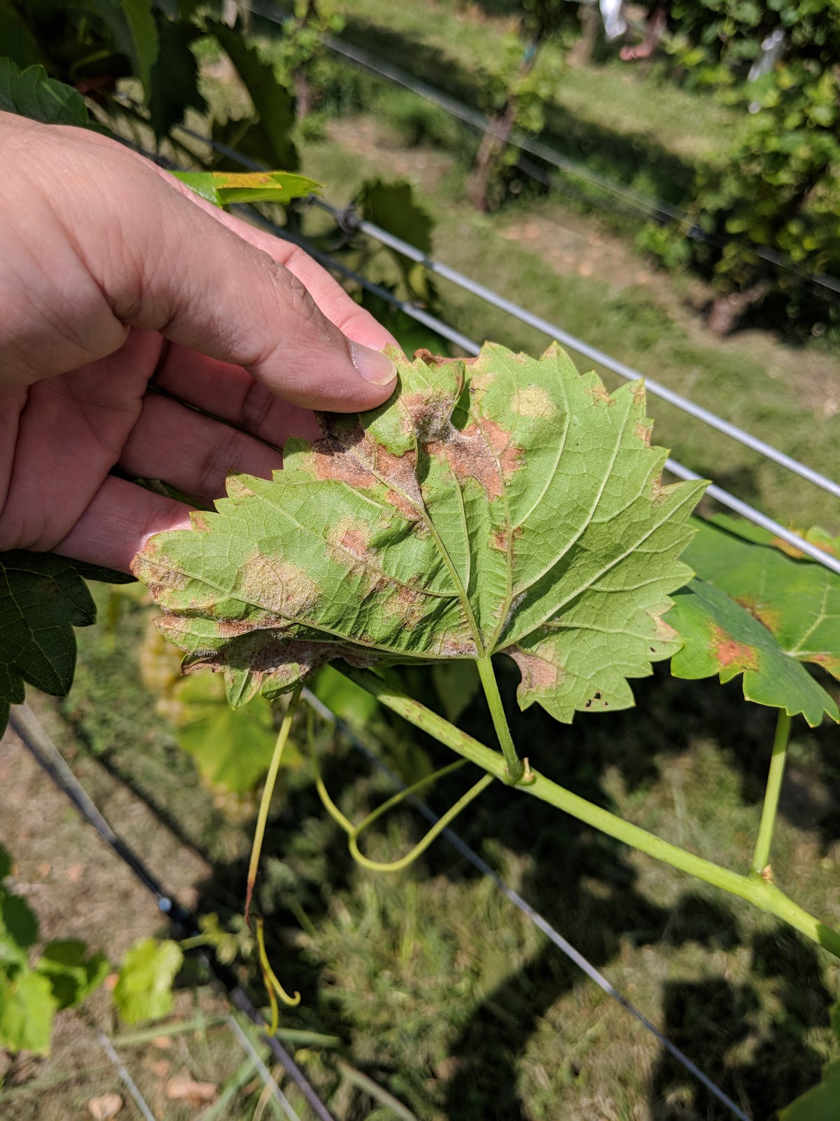 As usual, it is much better and easier to have a preventative program than trying to play the catch-up game. There are many good protective materials for downy mildew, such as Revus products, Zampro, Forum (Please note that these three share the same mode of action (FRAC=45 (+ 40 for Zampro), and Ranman (FRAC=21). In our small trial, fixed copper (FRAC=M1) worked pretty well against downy mildew when we compared with captan (FRAC=M4). Captan worked too, but a fixed copper product lasted longer than captan. However, some wine makers do not like to see captan or copper used late in the season, so, this time of the season maybe the best timing to use copper and captan for downy mildew. You can also use a phosphorous acid product (FRAC=33) as well (watch out for the rate!). For some cultivars, you may still use zirum (FRAC=M3) which has a 21-day PHI. Please mix and match to rotate among mode of action groups.