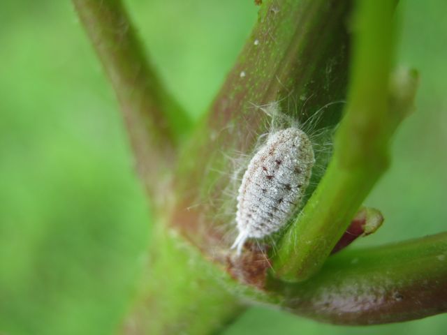 I have seen a small outbreak of mealybugs in our field (please click the picture to see a larger image). It is a good news for me because I was looking for them, but as you may know, this insect can vector a virus that can cause grape leaf roll disease. Thus, if you have seen these bugs, please contact me so that I can visit your place to collect samples. It is very important for us to know which species are present in VA in order to understand the risk of leaf roll spread. It is a part of on-going leaf roll project and we need more information on this important pest. Mealybugs are about less than 1/8 of an inch in length and often covered by white hair-like tissues. Often time, you will find mealybugs underneath the leaf or within the bark. They seems to like shade and often associated with ants which like to feed on the honeydew that is secreted by mealybugs.