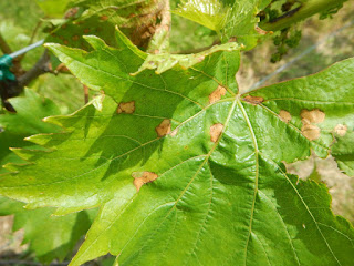 I noticed that some of our ‘Cheloir’ vines are in trace bloom and also it has quite a bit of black rot. As I suspected, the cold rains we received were long enough for pathogens beyond Phomopsis to be able to infect vines. If you have not seen black rot lesions on leaves and shoots, the pictures below are good examples. If you click on them, it should open a larger picture. Please note the small dots on these lesions. These are fruiting bodies that contains spores.