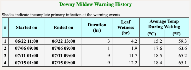 Red Hill: downy mildew risk events on 7/2 and 8.