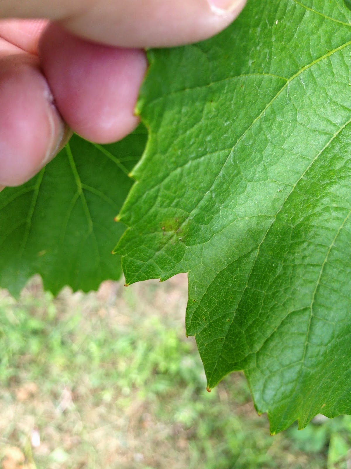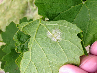However, it looks like at out site, the downy mildew pathogen is taking advantage of the weather conditions. Although our last application of mancozeb and sulfur was only 6 days ago, I noticed that some of older leaves show symptoms of downy mildew (i.e., the infection might have happened prior to the previous application). At this point, many of leaves look like the first picture, and disease incidence is probably less than 0.5%, thus, it is difficult to find them; however, we came across with a few leaves with clear symptoms as in the second picture.